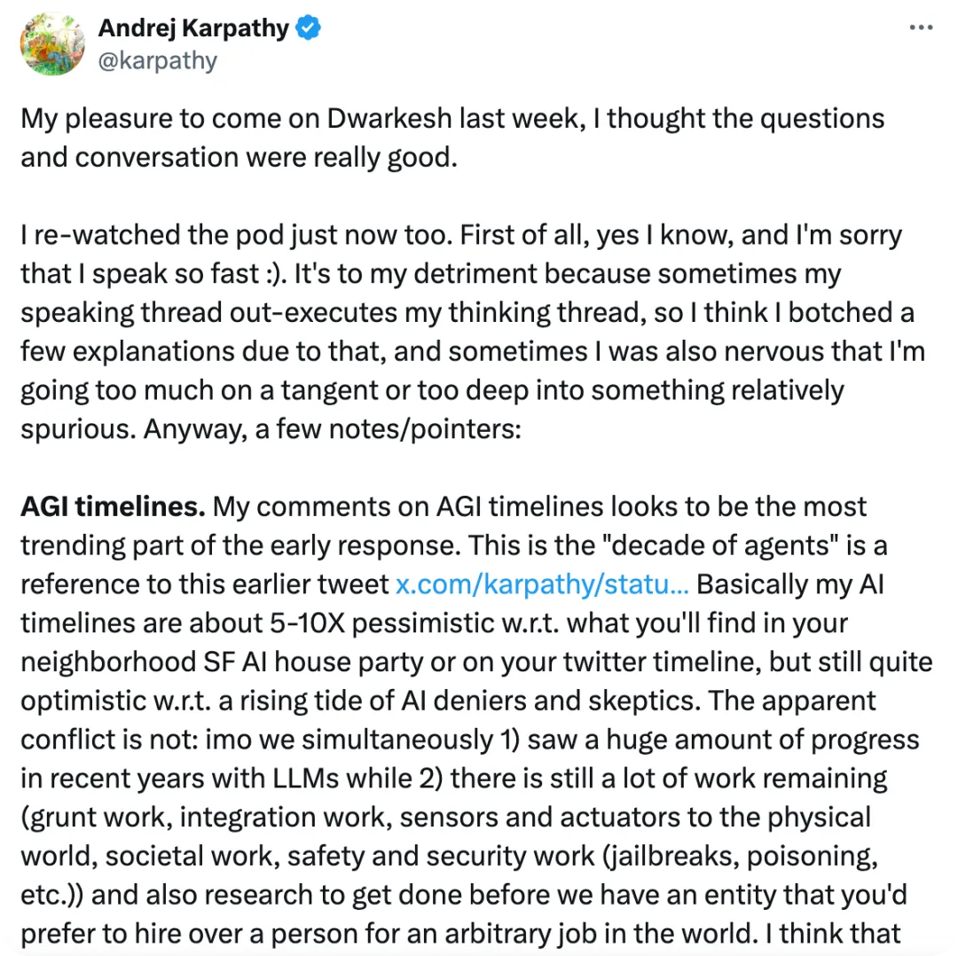 在“AGI 近在咫尺”的热潮中,这位 AI 领域的核心人物选择踩下了刹车。Andrej Karpathy,曾任特斯拉 AI 总监、OpenAI 创始成员的硅谷顶尖技术专家,近日在 Dwarkesh Patel 的播客中发表了一场长达两个多小时的深度对话,并在随后发布的长文中系统阐述了他对人工智能发展的思考。