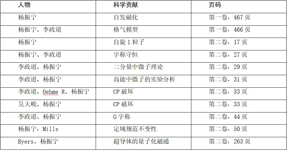杨振宁对理论物理学的贡献范围很广,包括粒子物理学、统计力学和凝聚态物理学等领域,在理论结构和唯象分析等方面都取得了重大成就。本文对出现在《20世纪物理学》一书中杨振宁的学术成果,按照页码的先后顺序,以表格形式进行了梳理(见表1)。