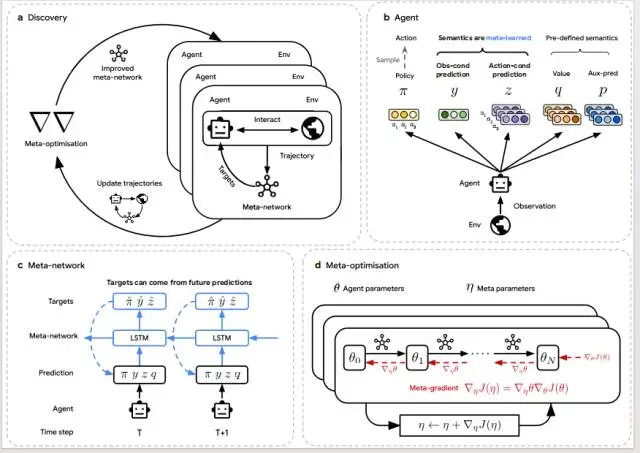 图|智能体自主发现 RL 算法的全过程:(a) 发现过程:多个智能体在不同环境中并行交互与训练,遵循由元网络定义的学习规则;元网络在此过程中不断优化,以提升整体表现;(b) 智能体结构:每个智能体输出策略(π)、观测预测(y)、动作预测(z)、动作价值(q)与辅助策略预测(p),其中 y 与 z 的语义由元网络确定;(c) 元网络结构:元网络接收智能体的输出轨迹及环境奖励与终止信号,生成针对当前与未来时刻的目标预测;智能体据此最小化预测误差进行更新;(d) 元优化过程:通过对智能体更新过程的反向传播计算元梯度,优化元参数,以最大化智能体在环境中的累计回报。