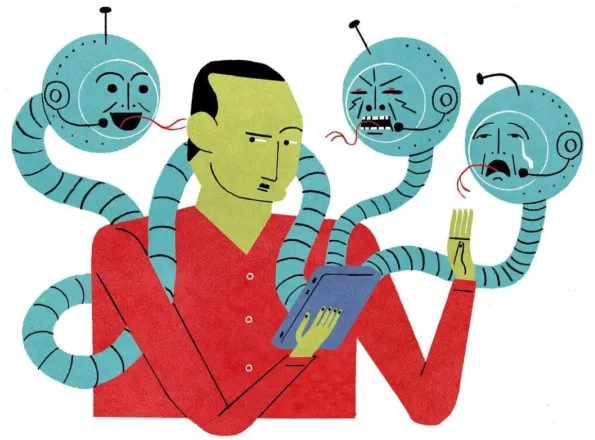 ▷图1 “为什么人工智能聊天机器人会说谎和表现怪异?照照镜子看看自己。”(绘图:戴维·普朗克特)