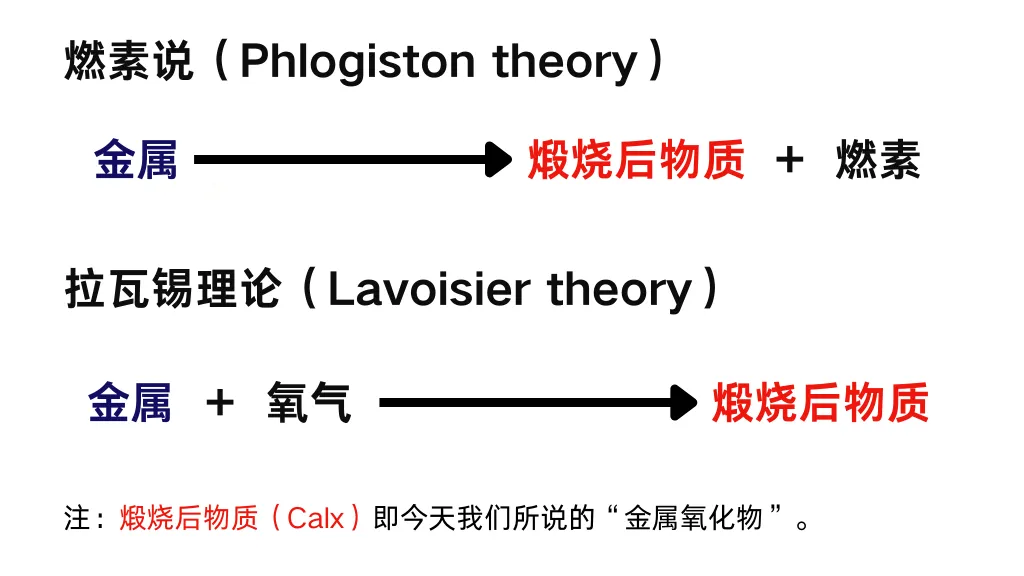 17-18世纪,化学家试图解释燃烧现象,曾提出“燃素”(phlogiston)这一假想实体。“燃素说”认为,可燃物质含有“燃素”,燃烧是燃素释放的过程,金属煅烧后变成金属灰(氧化物),被视为“失去燃素”。又因为金属煅烧后重量增加的实验发现,燃素被额外假设“具有负重量”。