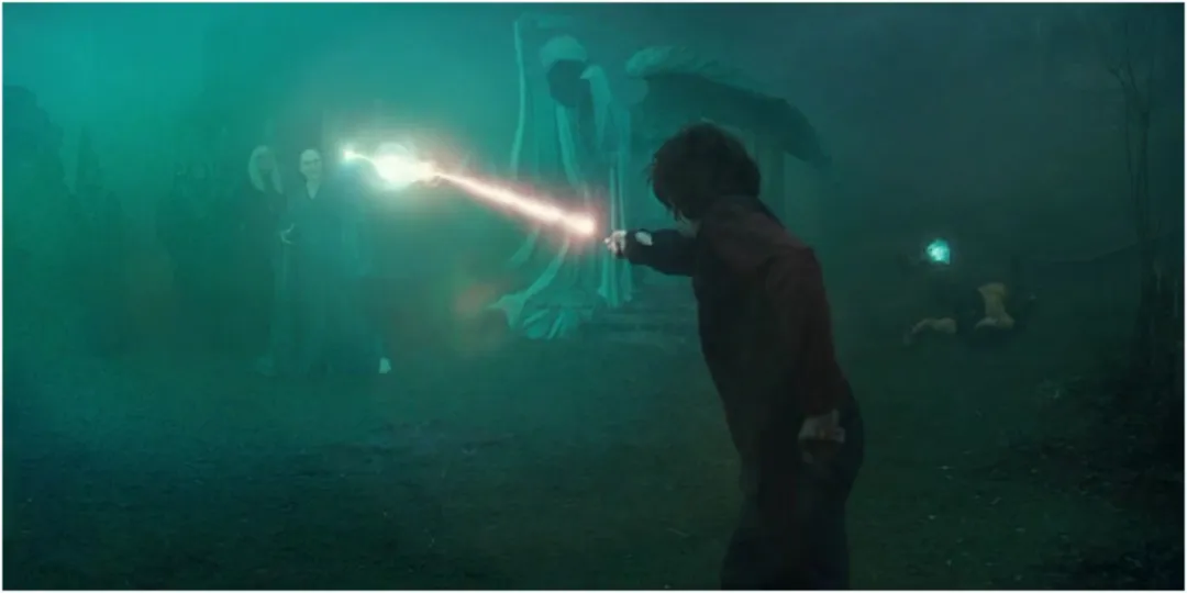▷图 5. 《哈利·波特与火焰杯》中,哈利与伏地魔在墓地的魔杖对决。由于两根魔杖的杖芯来自同一只凤凰的羽毛,它们产生了“闪回咒”现象,魔杖之间的连接迫使伏地魔魔杖中的灵魂碎片和受害者影像显现出来,最终哈利借此机会成功逃脱。这个场景被一些剧评人评为哈利波特系列电影中十大机械降神场景之一。来源:CBR.com
