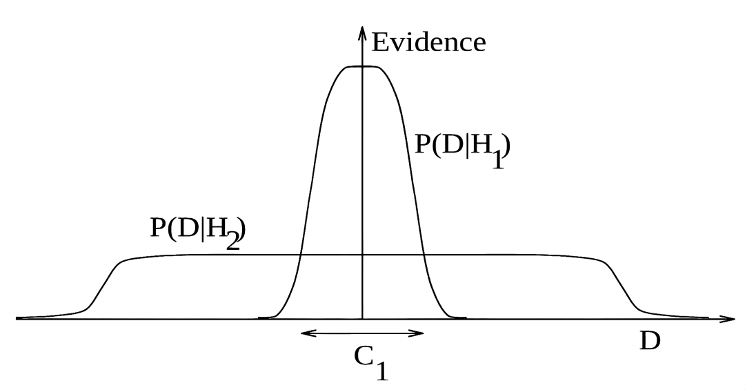 一个简单模型H1只能做出有限范围的预测,如P(D|H1)所示;而一个参数更多的模型H2能够预测更多种类的数据集。然而,这种复杂性也相应地付出了预测强度上的代价,对于特定数据集C1,H2对数据集的预测强度反而不如H1。假设两个模型具有相同的先验概率,那么如果数据集落在区域C1中,简单模型H1将是更可能的模型。