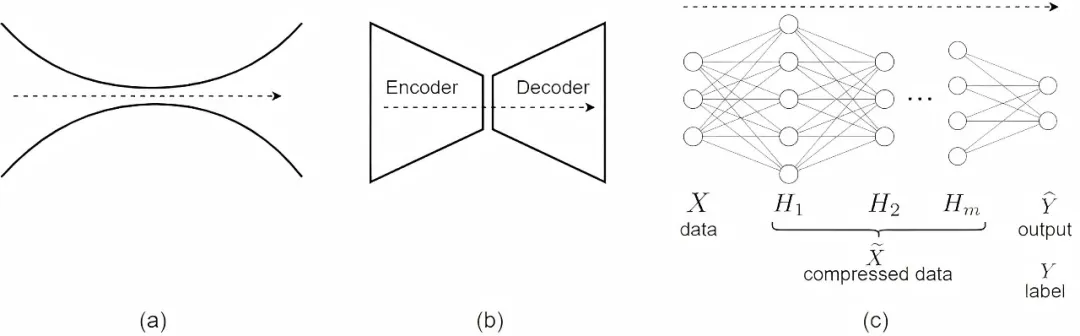 ▷图 10. 信息瓶颈示意图.(a)信息瓶颈,(b)作为信息瓶颈的自编码器,以及(c)作为信息瓶颈的常规的多层神经网络.