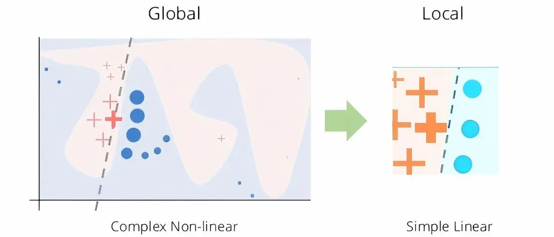 局部可解释模型:当无法全局使用简单模型时,在局部区域内用简单模型(如线性模型)近似复杂模型的决策,从而提供对预测结果的直观解释。