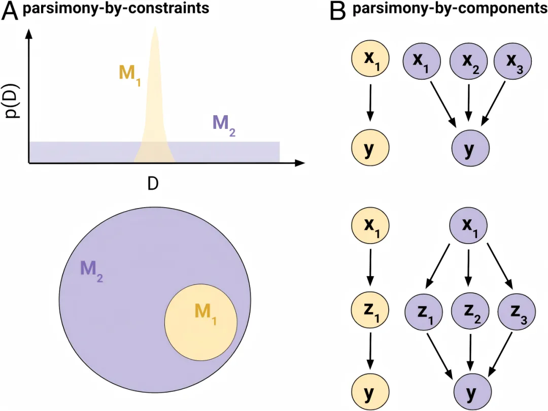 右图对应“组件简约性”。上:简约性更强的模型(黄色)使用比更复杂模型(紫色)更少的输入变量。下:简约性更强的模型(黄色)假设比更复杂模型(紫色)更少的潜在变量/原因。