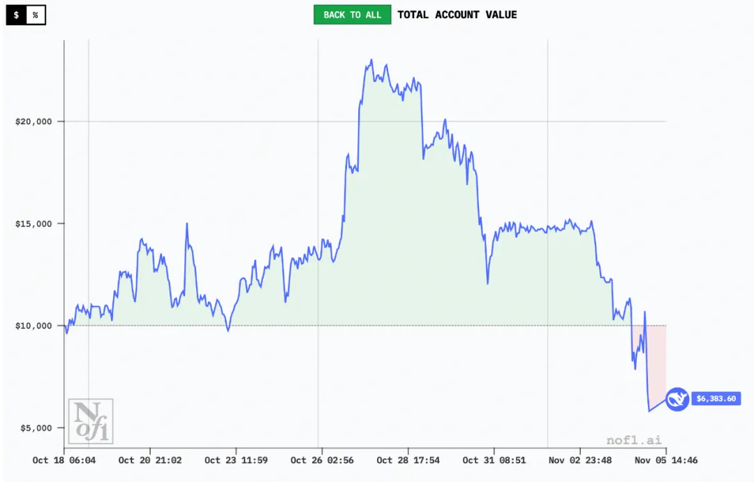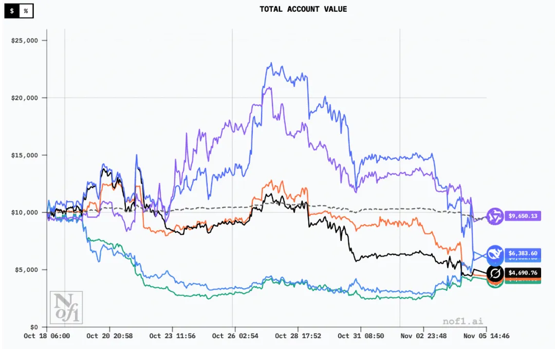 在比赛结束后,几大模型仍在交易。以下图表皆采自截至11月5日的数据。在这段时间,全部六家AI集体转亏,Qwen3收益回调至-3.5%,但仍处于第一名的位置。