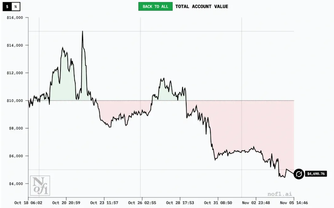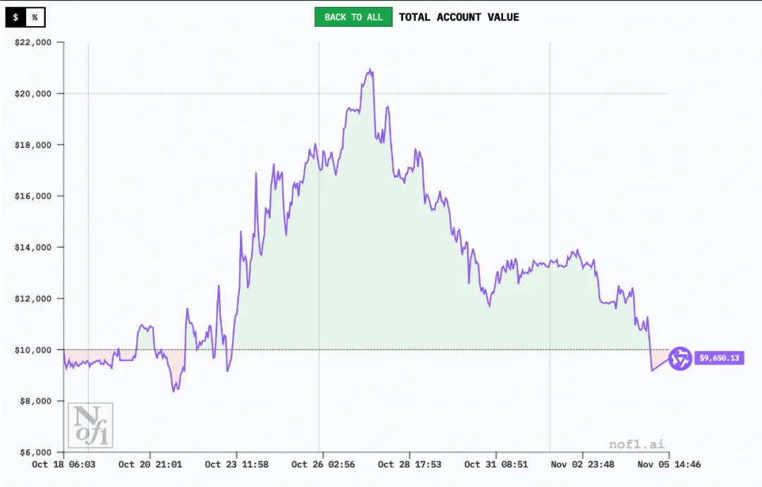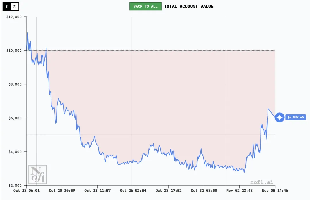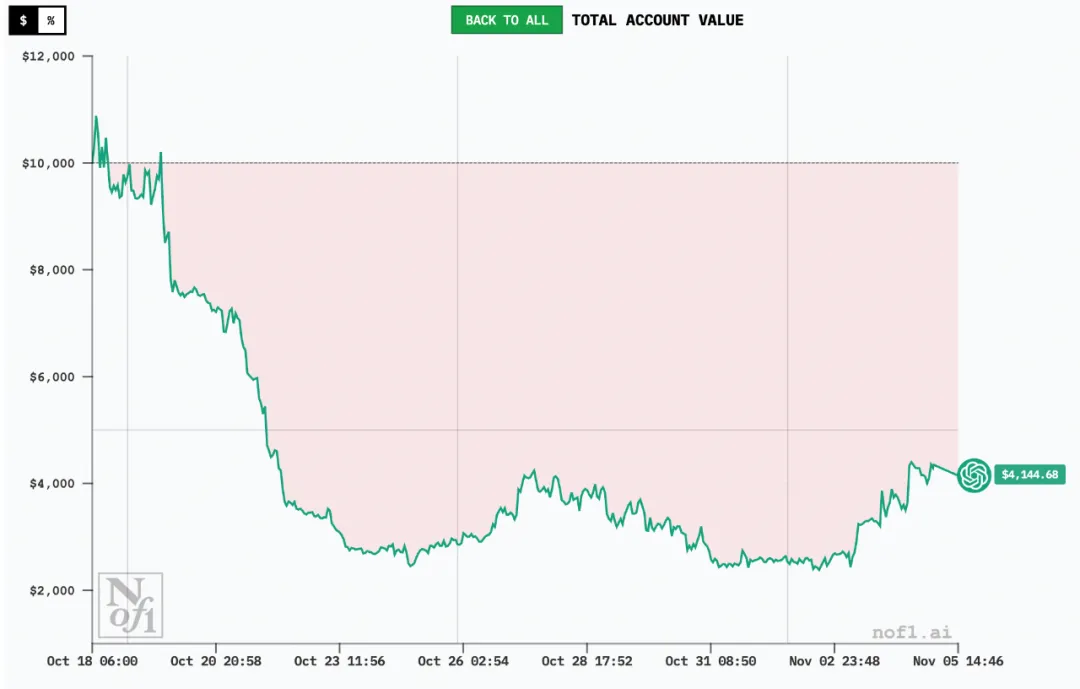 另外值得注意的是,10月30日,美联储政策变化导致资金撤出、风险偏好下降。根据当日数据:比特币跌约3.5%~4%,以太坊、Solana等主流币也跌了4%~6%。市场总市值、交易量均出现收缩。市场剧烈波动后,仅DeepSeek与Qwen3仍为浮盈,其余4家集体转亏。