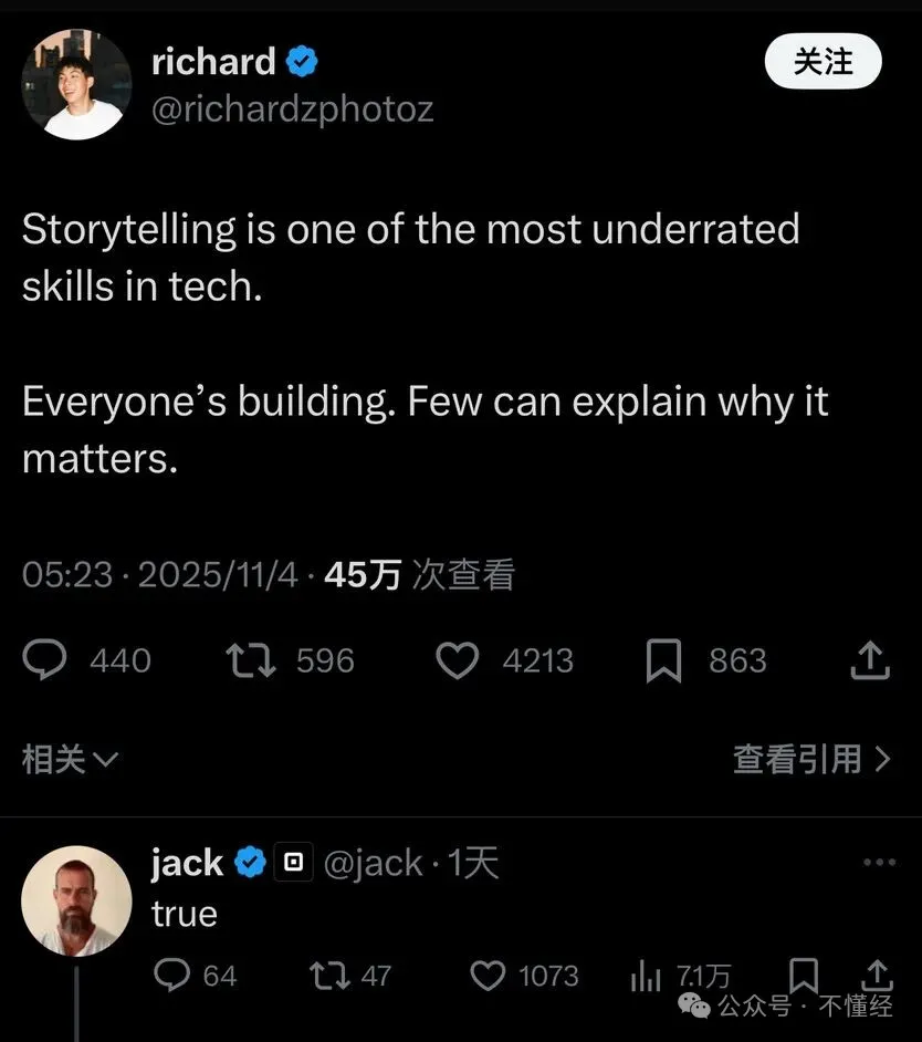 在科技界,讲故事是一种被严重低估的技能。每个人都在做东西,很少人能解释它们的意义和影响。(推特创始人杰克表示同意)