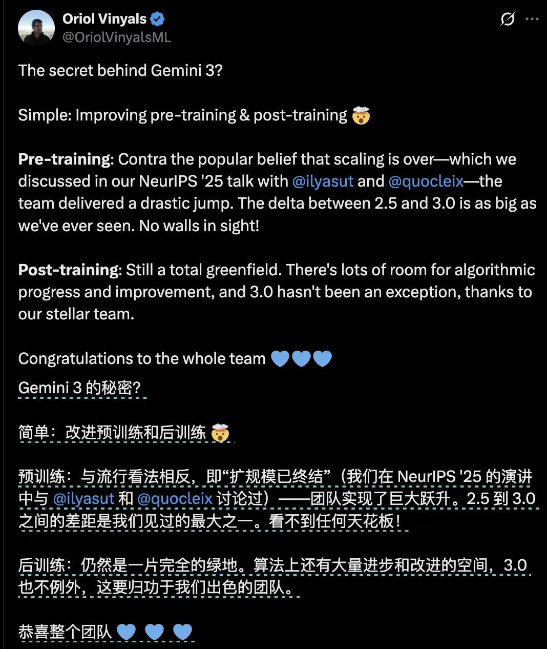 Oriol Vinyals,Google DeepMind的VP of Research、Deep Learning Lead和Gemini项目的联合负责人,在Gemini 3发布后发推文说:“Gemini 3的秘密?简单:改进预训练和后训练。后训练仍然是一片完全的绿地。算法上还有大量进步和改进的空间”。他特别强调:“与流行看法相反,即‘扩规模已终结’——团队实现了巨大跃升。2.5到3.0之间的差距是我们见过的最大之一。看不到任何天花板!”