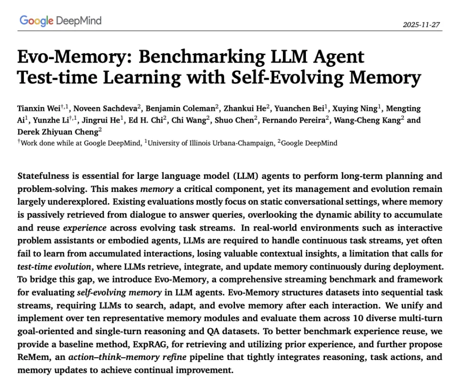 然而,仅仅几周后,11月27日,DeepMind的另一个团队联合UIUC抛出了另一篇论文《Evo-Memory》 。