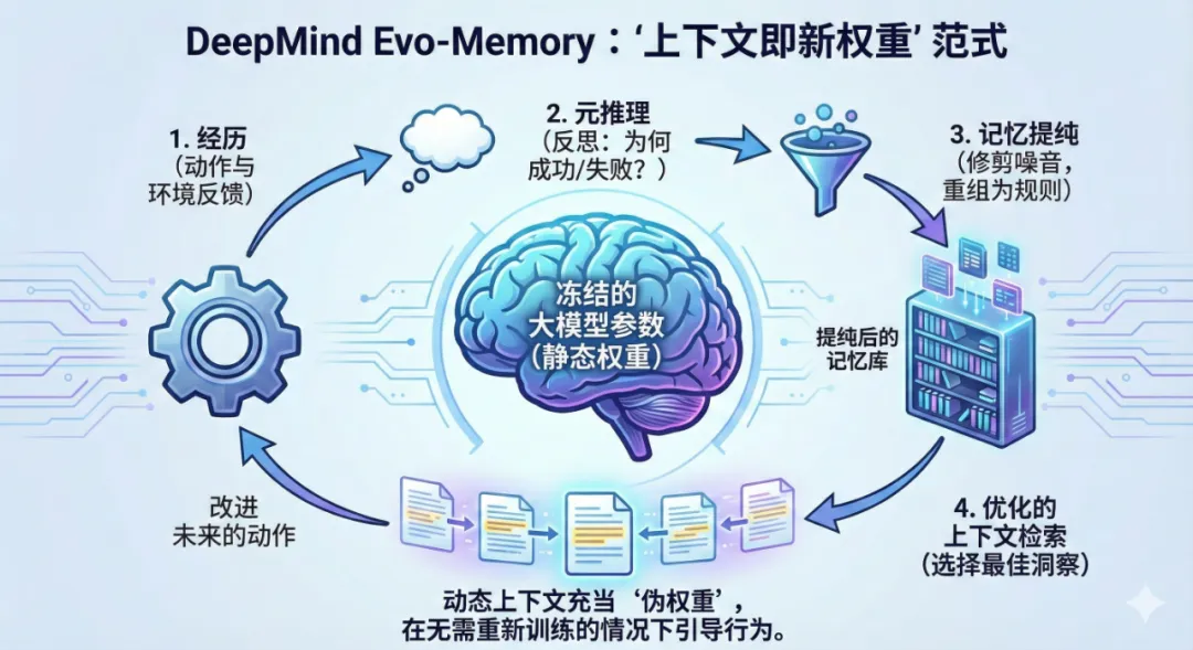 在过去,我们认为,上下文工程只是人类教 AI 做事的权宜之计。但Evo-Memory证明了,当上下文具备了自我反思、自我修剪、自我沉淀的能力时,它就不再是静态的提示词,它变成了流动的权重。