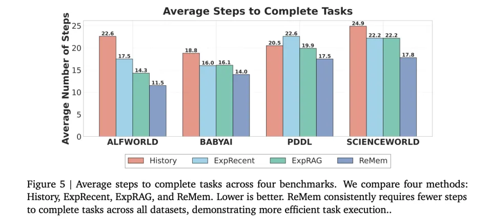 这种机制的效果是立竿见影的。 在Alf World这个虚拟家居环境中,把冷藏过的西红柿放进微波炉这个任务,基准模型平均需要22.6步才能完成。而配备了ReMem的模型,只需要11.5步。因为它学会了识别哪些过往任务的经验可以迁移,哪些细节差异需要警惕,从而少走了近一半的弯路。