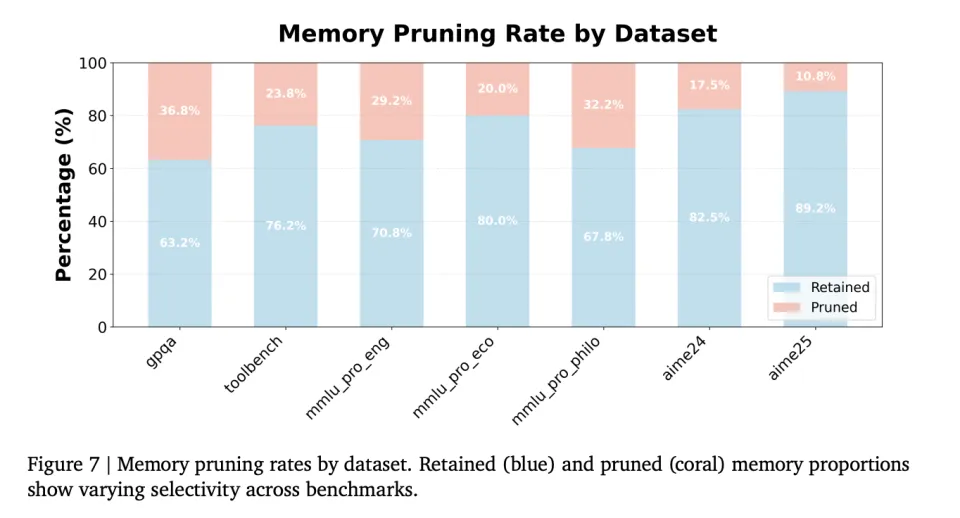 更有意思的是记忆修剪率的差异。在GPQA这种跨学科科学问答数据集上,模型会主动删除36.8%的记忆条目。因为这些记录来自不同领域,对当前问题没有参考价值。而在AIME数学竞赛数据集上,修剪率只有17.5%,因为数学题之间的解题策略往往是相通的。