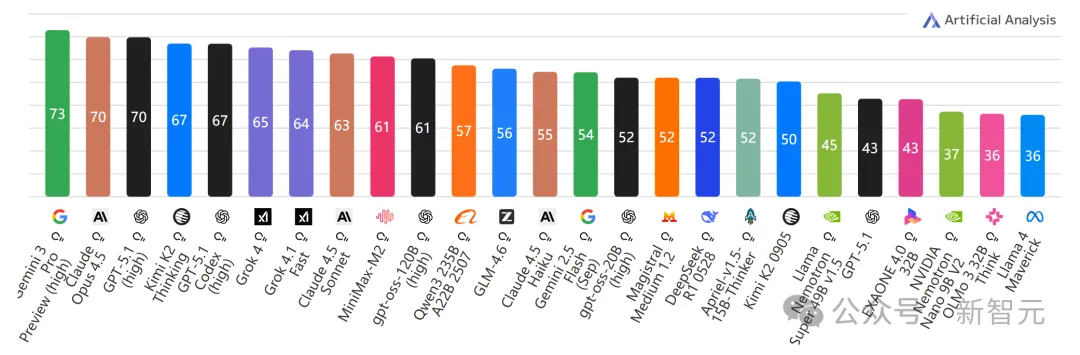 在更强调综合智能的Artificial Analysis Intelligence Index排行榜中,Gemini 3同样以73分位居榜首。