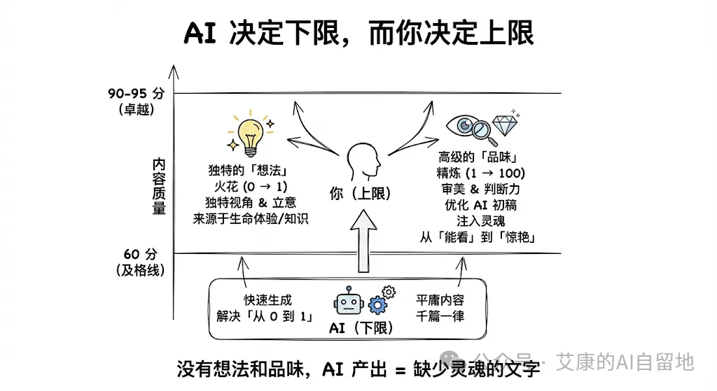 没有好的想法和品味去主导,再强大的 AI,也发挥不出它的价值,产出的永远是缺少灵魂的、千篇一律的文字。