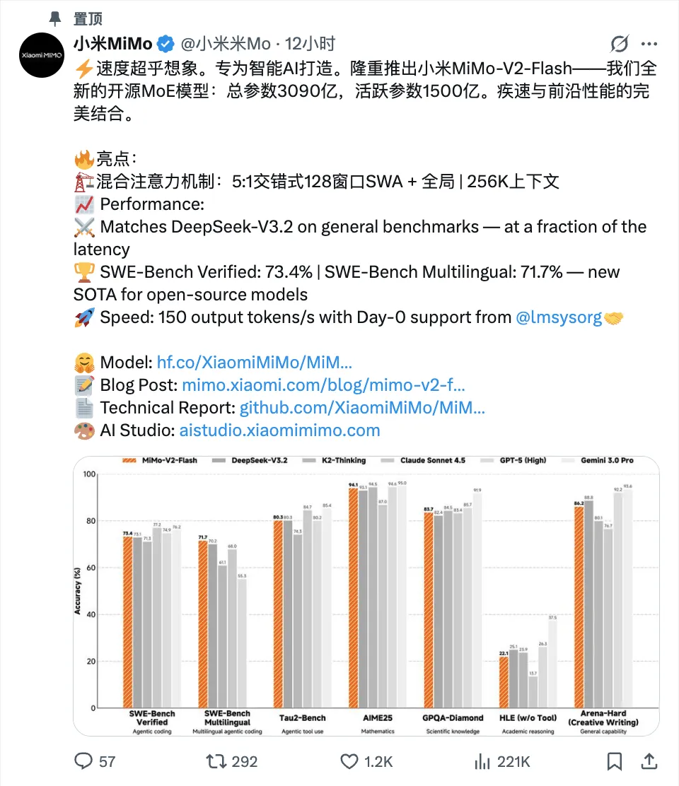 基本上,大部分评估基准已经超过或者与 DeepSeek-V3、Kimi、Qwen 等模型相当,而这些模型的总参数量通常是 MiMo-V2-Flash 的两倍到三倍。