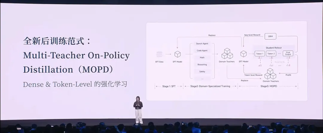 除了关注预训练结构的高效性,我们还在思考如何扩展强化学习训练的 Compute。强化学习训练通常非常不稳定,因此我们提出了 MOPD(Multi-Teacher On-Policy Distillation,多教师在线策略蒸馏) 范式。