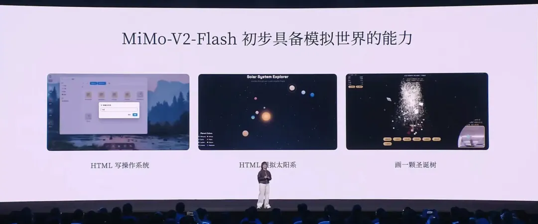 MiMo-V2 已经初步具备在语言空间模拟世界的能力。比如,我们可以通过 HTML 让它写一个操作系统,很多功能都是可实现的;或者写一个 HTML 模拟太阳系;甚至做一个画圣诞树并产生交互的小 Demo。