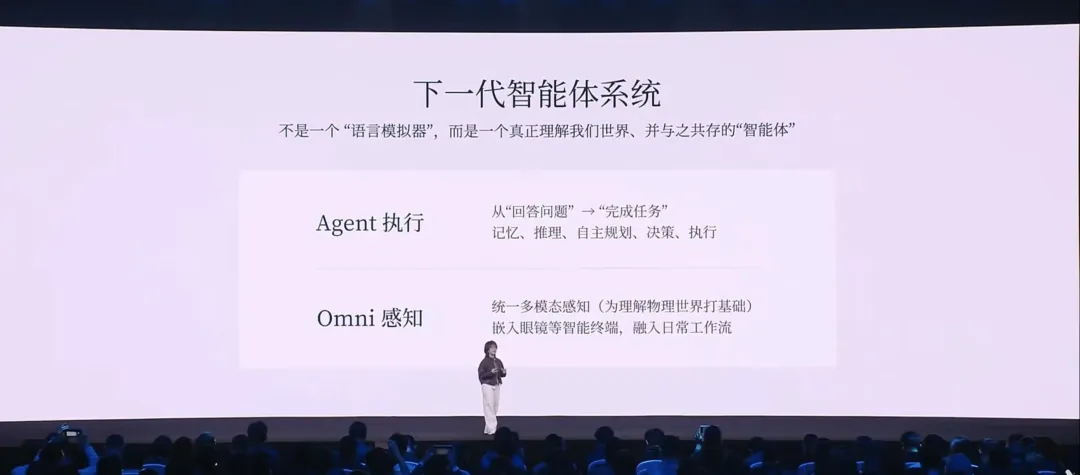 下一代智能体必须具备两个潜能: 第一,从“回答问题”变成“完成任务”。 这不仅需要记忆、推理、规划能力,更需要一个 Omni(全模态)的感知能力。做一个统一的动态系统非常必要,这是理解世界的基础。有了这个基础,模型才能无缝嵌入到像眼镜这样的智能终端,融入我们的生活流。