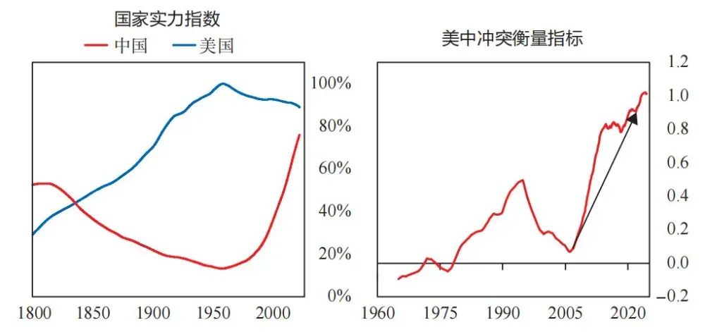 就美国和中国的大国冲突而言,美国相对衰落以及与中国的冲突在增加,这是客观上无可争议的。下面两张图显示了我对中美综合国力的衡量和冲突强度的评估。这表明大国冲突和“修昔底德陷阱”效应在起作用。