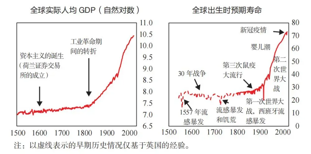 正如上图所示,实际 GDP 和预期寿命呈指数级增长,这是因为知识的加速复合增长,这种增长应该会继续,因为人工智能正在推动其复合增长。