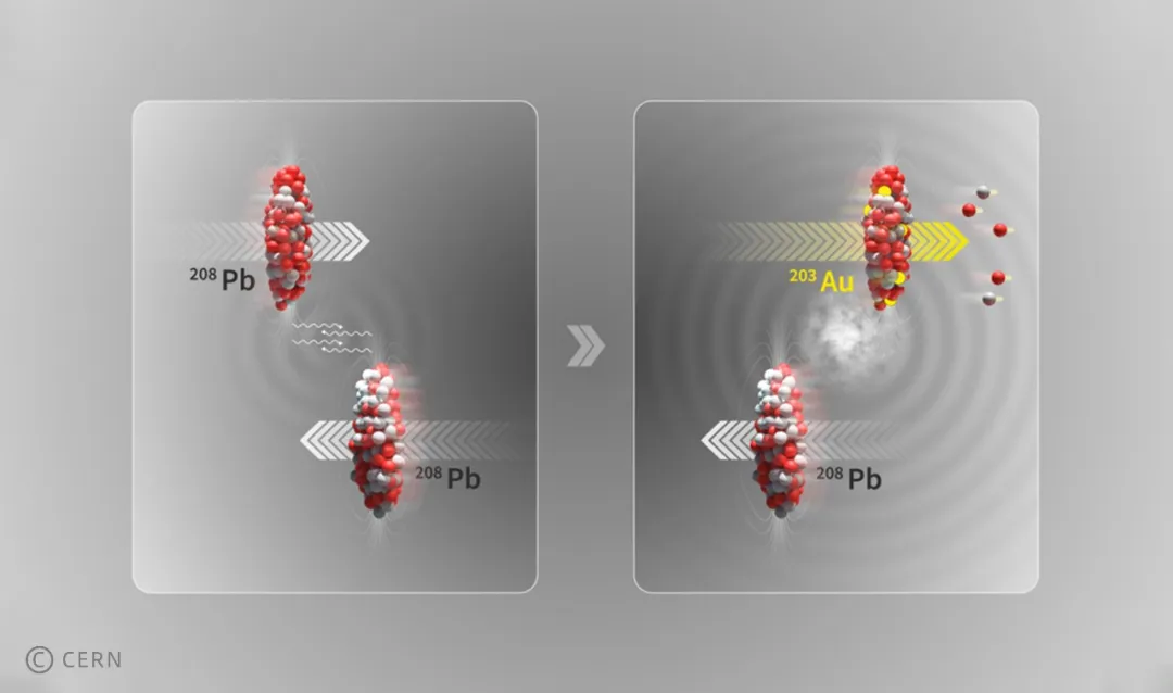 他们让两束几乎以光速飞行的铅离子束彼此对撞,但是在大多数时候,这些离子并不会正面碰撞,而是“擦肩而过”。当这种“擦肩而过”发生时,一个铅离子周围的强电磁场会产生能量脉冲,激发另一个铅原子核喷射出3个质子——这就意味着它的质子数82减少到79,从而变成了金。
