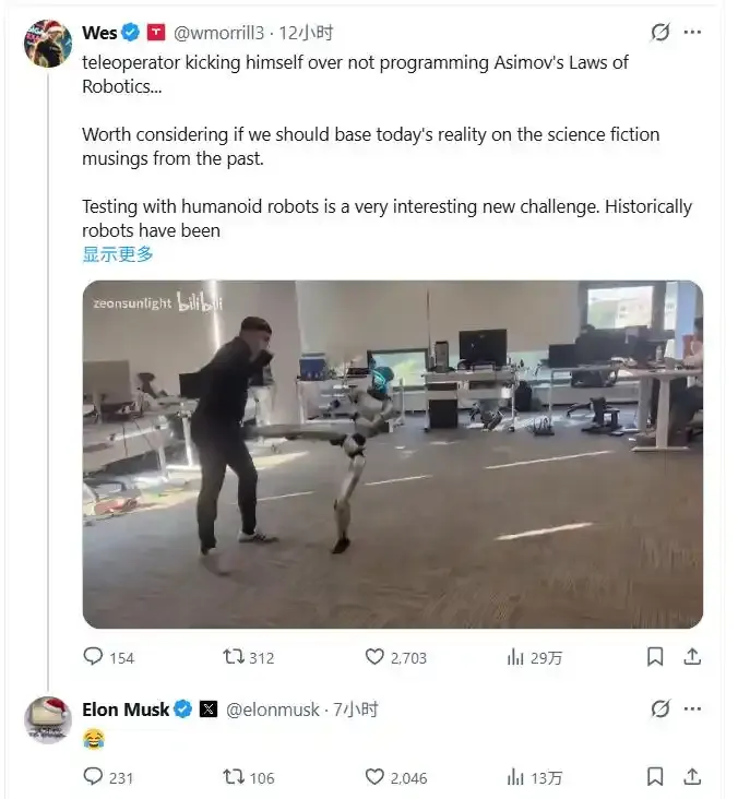 可当自家机器人殴打工程师致昏迷,并被索赔5700万美元时,他却沉默以对。还有,当同行机器人测试时突然给工程师送上“恶毒”一脚时,他则回复了一个引爆舆论的“笑哭”表情。