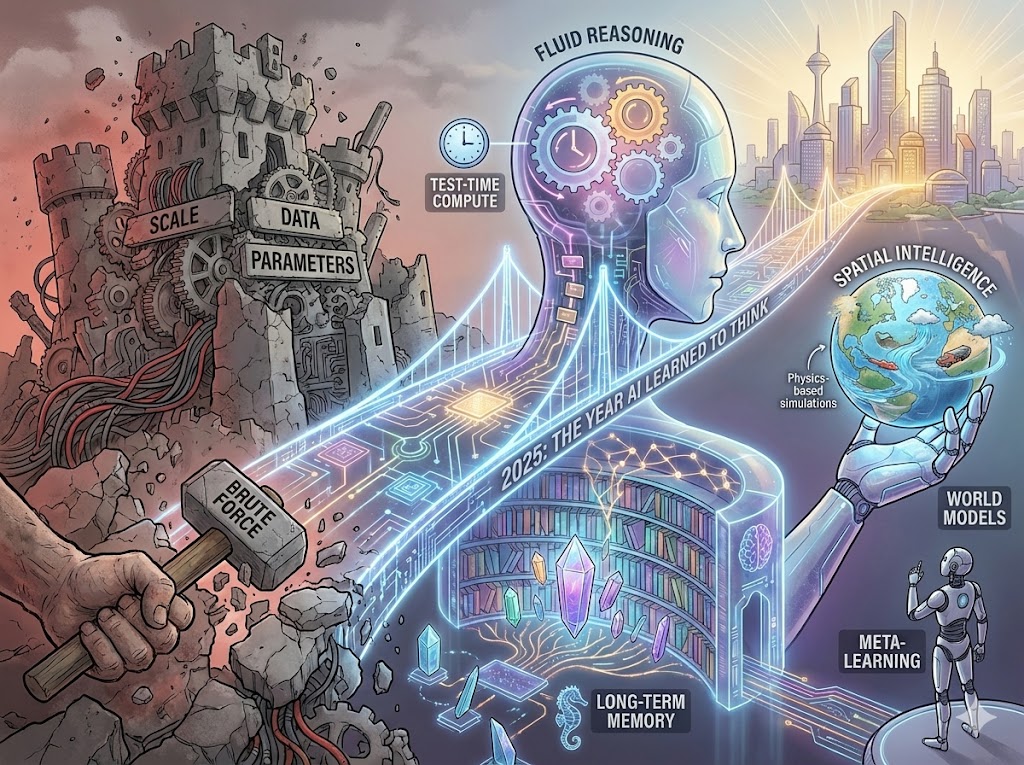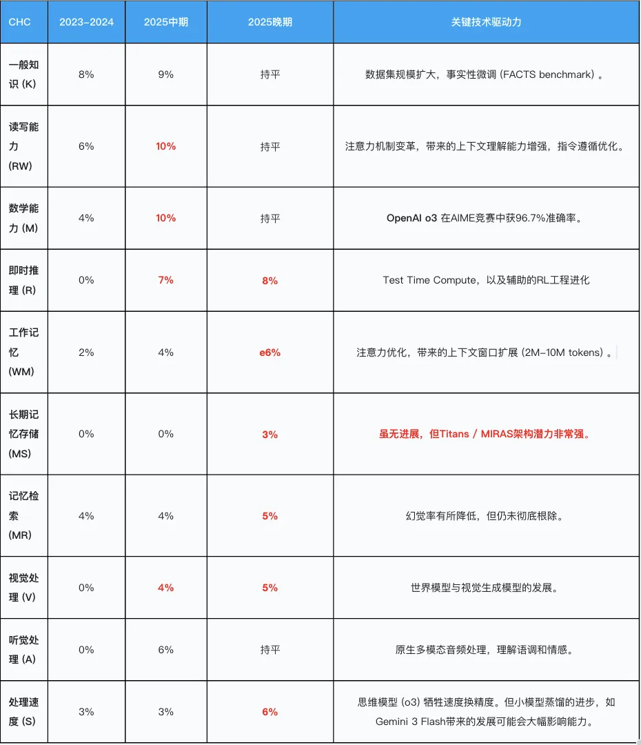 第一,2025年,技术进步主要集中在流体推理(Fluid Reasoning)、长期记忆(Long-term Memory)、空间智能(Spatial Intelligence)以及元学习(Meta-learning) 这四个领域。原因在于Scaling Law在单纯的参数规模上遇到了边际效应递减,为了突破AGI图片的瓶颈,业界被迫寻找新的增长点,即从「把模型做大」转向把「模型做聪明」。