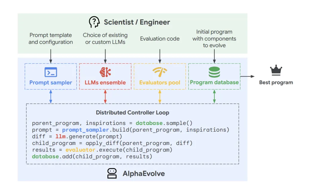 它是由系统使用Gemini Flash(追求速度)和Gemini Pro(追求深度)组成的模型集成,形成一个个独立的探索Agent。系统将当前表现最好的算法代码作为上下文输入LLM,并告诉这些Agent,去优化这段代码的某些具体方向。LLM由此生成多个变异版本的代码。在Agent规则的限制下,这些变异一般是逻辑层面的重构,例如改变循环结构、引入新的数学技巧或调整数据结构。生成的代码会被放入沙箱环境中执行。系统通过预定义的测试用例验证其正确性(Provable Correctness),并通过性能分析器测量其效率(如延迟、吞吐量或指令数)。那些既正确又更高效的算法将被保留,成为下一代的父本。由此,持续的多次优化,最终带来算法的最优优化。
