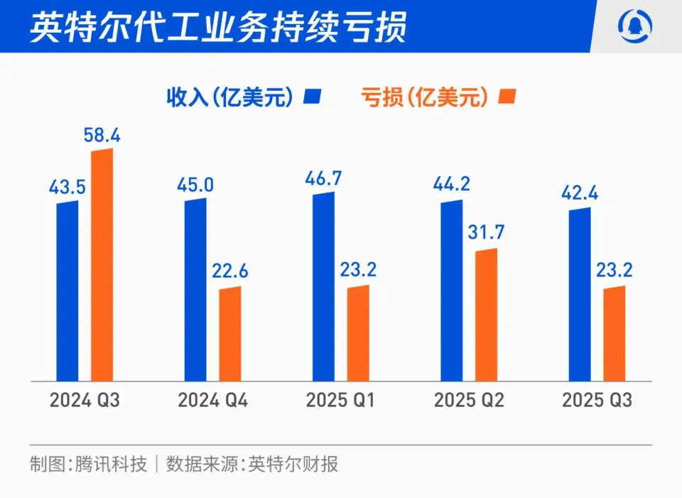 2025年第三季度,英特尔代工服务营收为42亿美元,但营业亏损高达23亿美元。尽管亏损额环比略有收窄,但据分析师估计,其2025年全年的亏损预计仍将达到95亿美元。