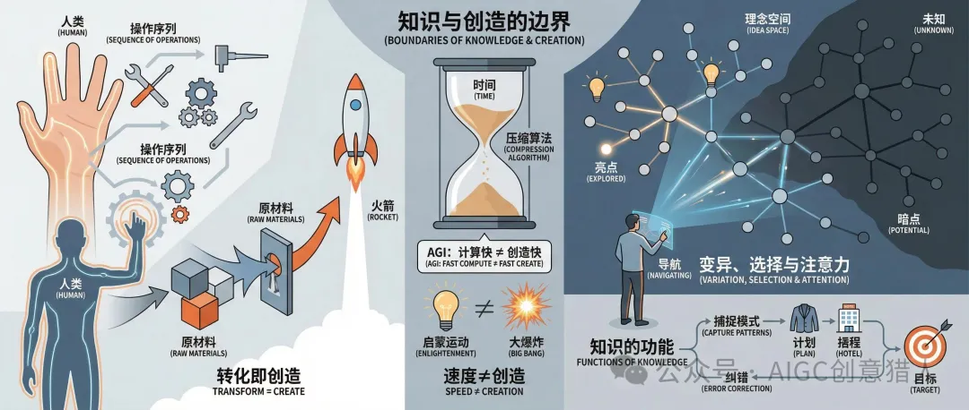 在计算和转化之后,是变异、选择和注意力,这与导航理念空间(或未知领域)有关,或者说我们如何创造知识。我们可以计算和转化,但在允许我们这样做的知识上我们有限制吗?