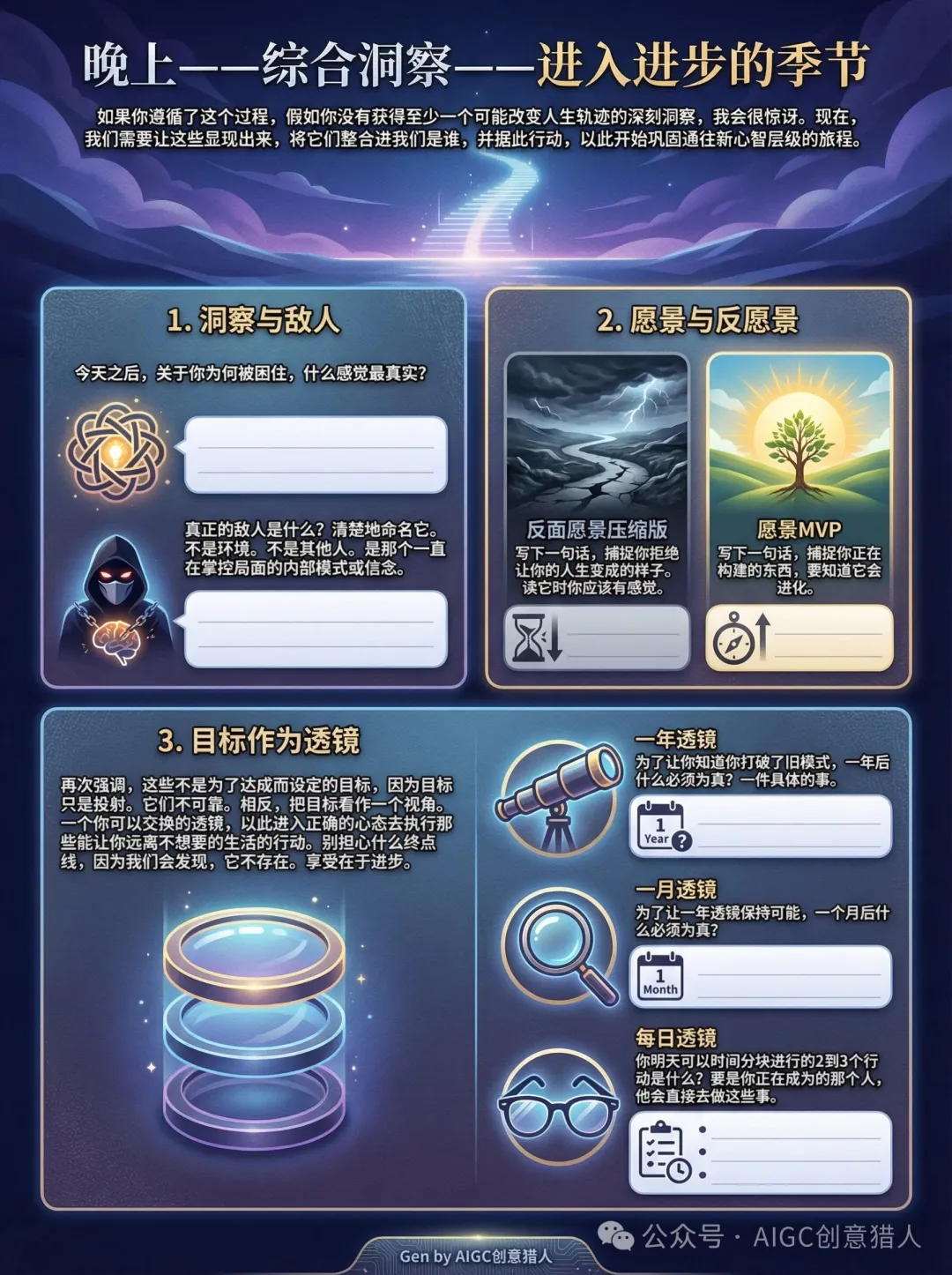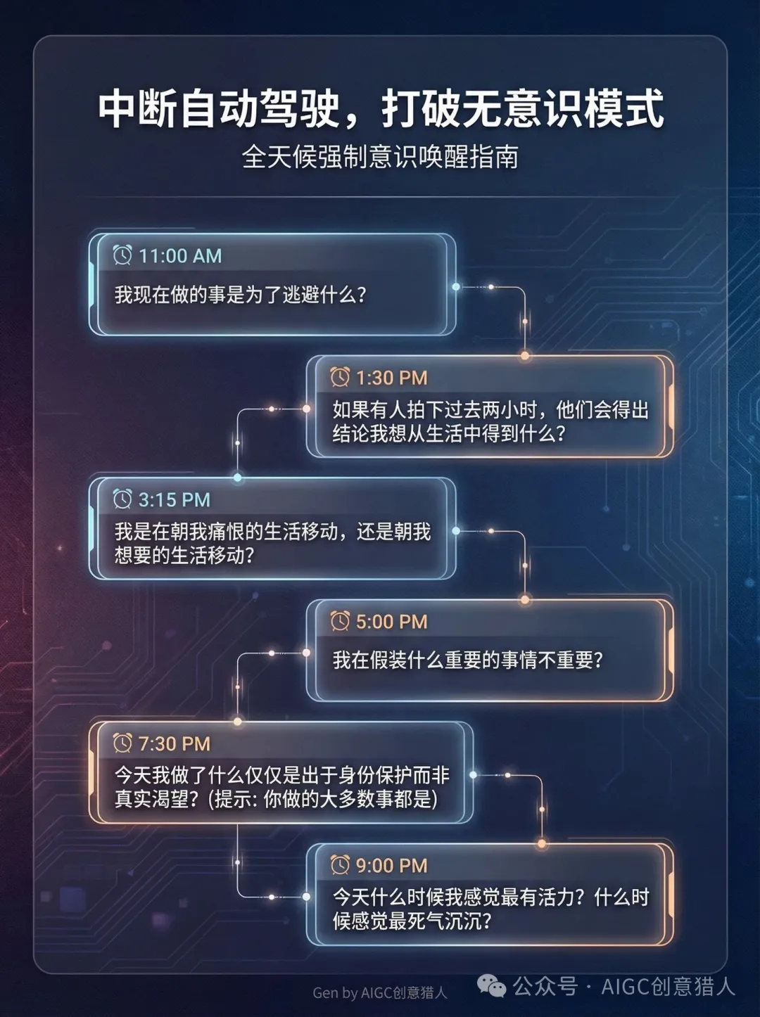 该协议结构设计为一天完成。早上,你进行心理挖掘以揭示自己隐藏的动机。白天,你用中断提示自己,让自己脱离自动驾驶模式并沉思你的人生。晚上,你将洞察综合成一个方向,并从明天开始朝其移动。