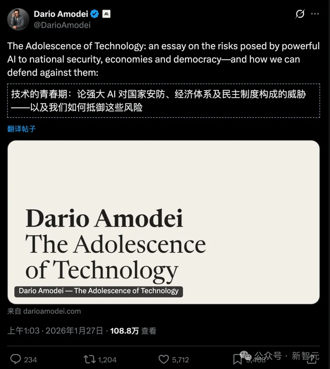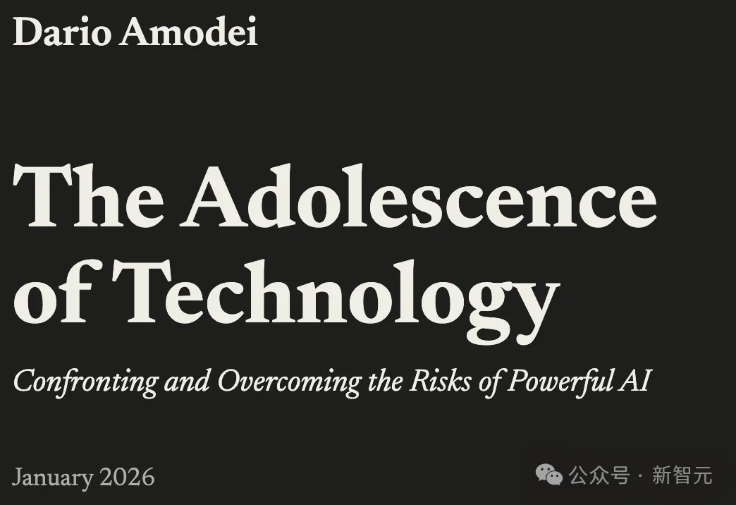 【新智元导读】Anthropic 掌门人 Dario Amodei 发布核弹级预警:2027 年,人类将迎来「技术成年礼」。两万字长文冷静剖析AI失控、生物恐怖、极权统治及经济颠覆五大危机,拒绝末世论;提出以「宪法AI」、管制与民主协作构建防线,呼吁人类以勇气通过这场文明的「成年礼」。