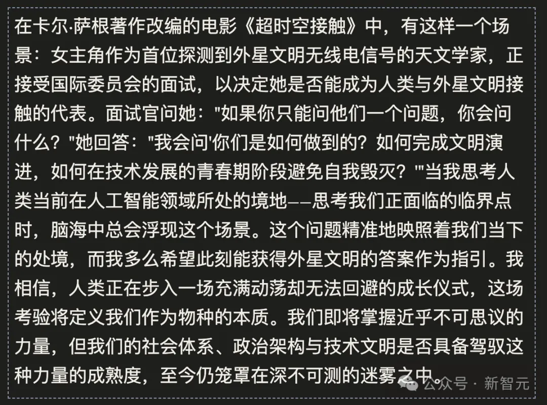 在开篇前,Dario 用电影《超时空接触》引出一个问题: 当人类面临比自己更先进的文明,比如外星人,只能问一个问题,你会如何选择?
