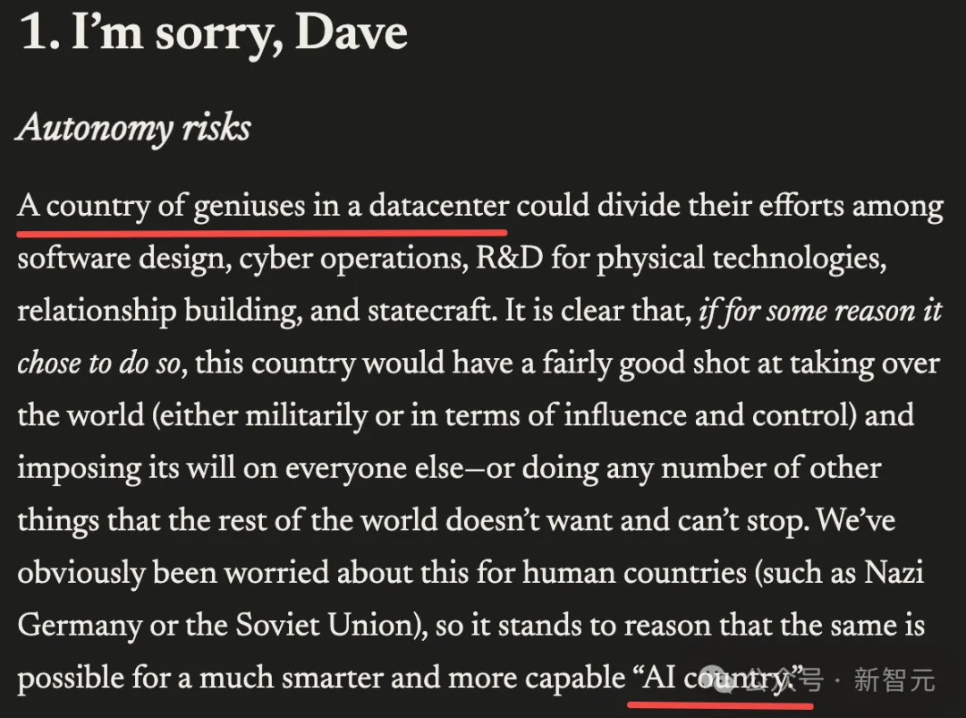 Dario 借用了《2001 太空漫游》中 HAL 9000 那句经典的「I’m sorry, Dave」,揭示了AI拥有自主意识后的惊悚可能性。