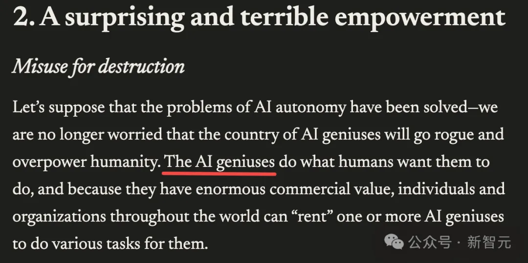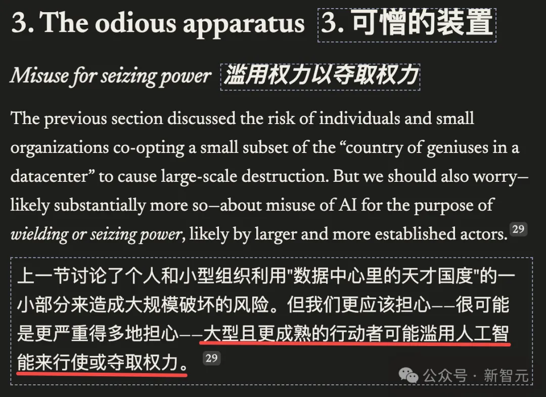 因为在如此强大的技术面前,权力的天平会极度倾斜,由于极少数人掌握了「数据中心里的天才国家」,他们事实上就掌握了对绝大多数人的绝对优势。