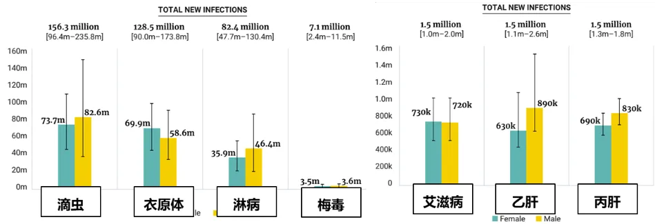 2020年世界范围内一些常见传染病(15-49岁人群)2020年新发病例数 | 图源:WHO