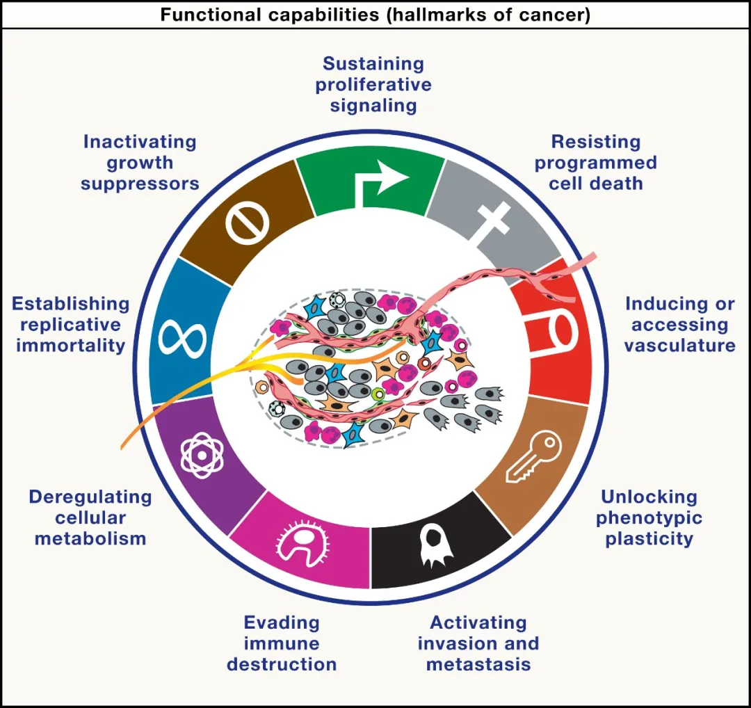 2011 年,他们增加了两大新特征:解除细胞代谢调控逃逸免疫摧毁。2022 年,Douglas Hanahan 加入了第九个特征——解锁表型可塑性