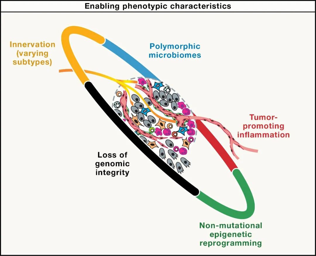 第二个维度是五大使能表型特征,包括基因组不稳定性、促肿瘤炎症、神经系统调控、多态性微生物组和非突变表观遗传重编程。这些特征本身不是核心功能,而是促使癌细胞获得九大特征的关键因素。