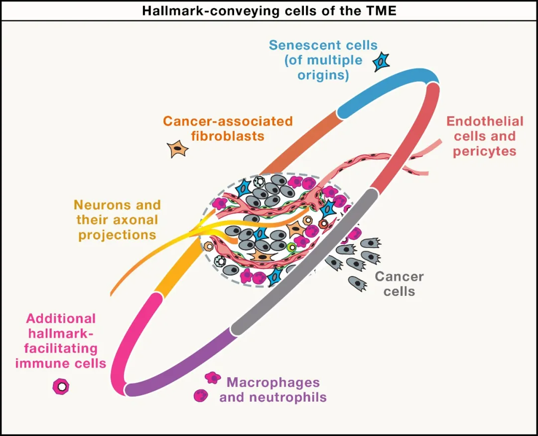 第三个维度是肿瘤微环境中的各种细胞——癌细胞、衰老细胞、癌相关成纤维细胞、神经元及其轴突投射、内皮细胞和周细胞、巨噬细胞和中性细胞,以及促进其他癌症特征形成的免疫细胞,它们像犯罪同谋一样,帮助癌细胞获得必要的特征。