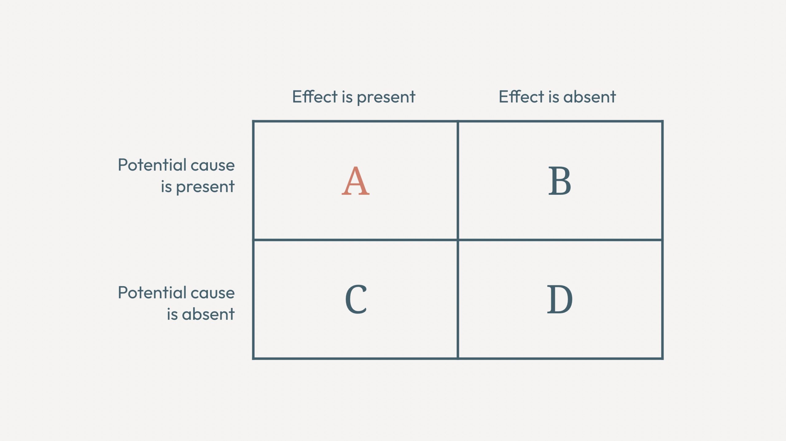 什么情况下我们最容易陷入虚假相关性?一个很好的识别方法是借用统计学领域的概念,使用列联表。下面的矩阵我借用自一篇关于因果错觉的研究论文,因果错觉与虚假相关性类似,但更进一步假设了因果关系。