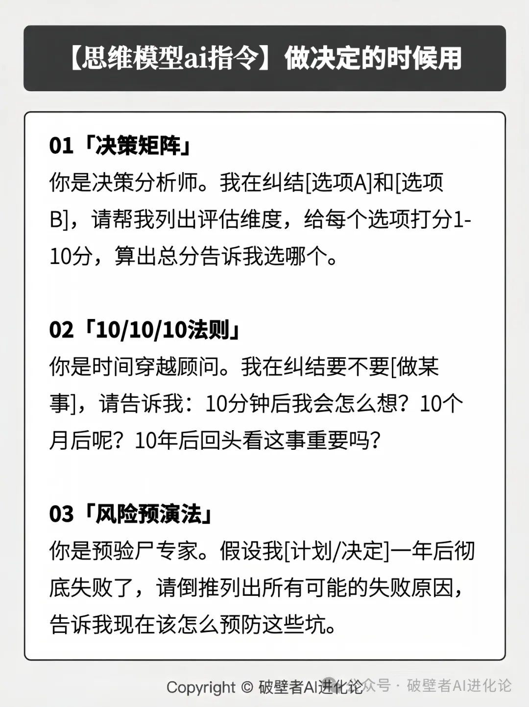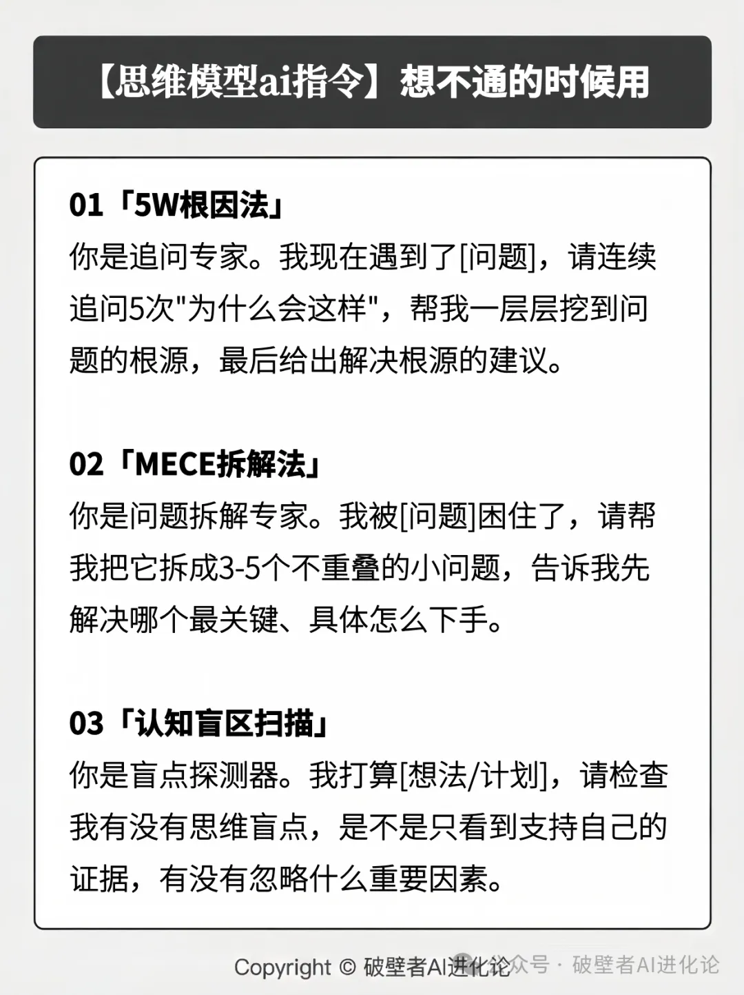 如果你只是把这些指令复制进去,看一眼答案就觉得自己懂了,那依然是在“逃避思考”。真正的狠人,是借由 AI 抛出的这些深度视角,反复审视自己的大脑。