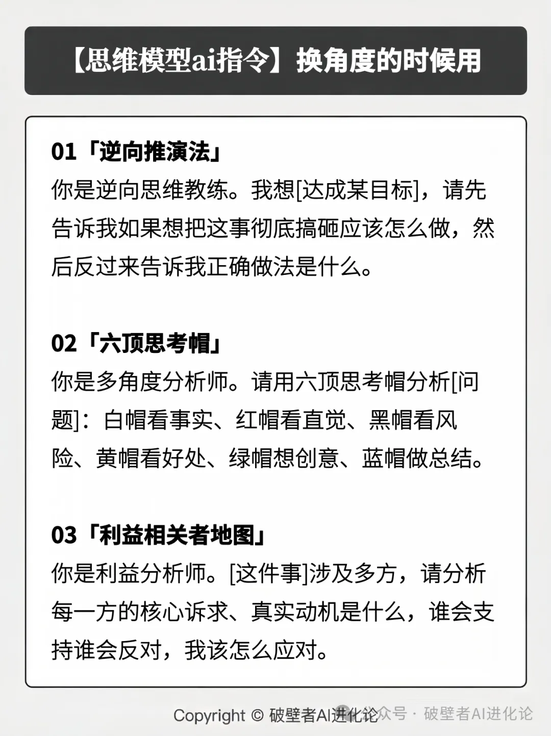 提示词:你是多角度分析师。请用六顶思考帽分析[某个问题]:白帽看事实、红帽看直觉、黑帽看风险、黄帽看好处、绿帽想创意、蓝帽做总结。