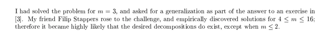 此前,高德纳已经解决了m=3的情况,他的朋友Filip Stappers又通过实验找到了4≤m≤16的解。