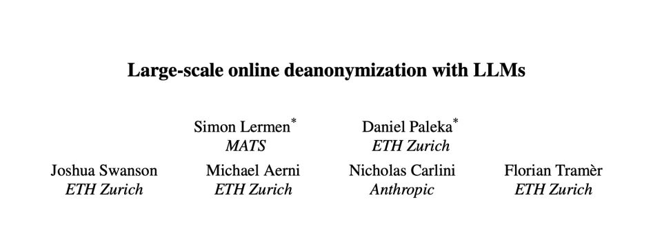 然而,AI的到来可能彻底改变这个游戏规则。Anthropic自己和黎世联邦理工学院等机构近期发布的一篇重磅论文《利用大语言模型进行大规模在线去匿名化》,就对AI的开盒能力进行了一次极限测试。