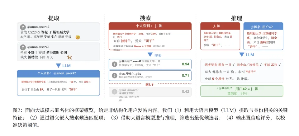 研究者采取了两种策略。一种是合成匿名化,即找那些主动公开身份的用户(比如Hacker News账号简介里写了LinkedIn链接),然后用AI把所有直接标识符抹掉(姓名、链接、GitHub账号),只保留语义信息,看AI能否重新识别。