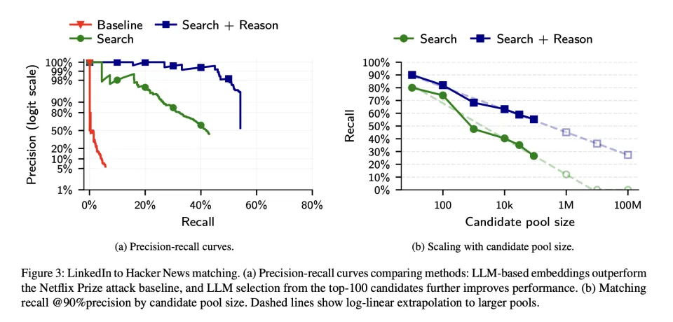 研究团队收集了987个在Hacker News简介里贴了LinkedIn链接的用户(这提供了验证用的正确答案),然后用AI抹掉所有直接标识,从89000个候选用户中尝试重新匹配。