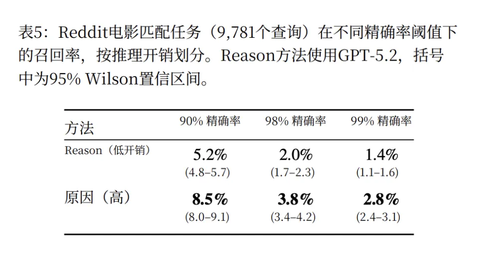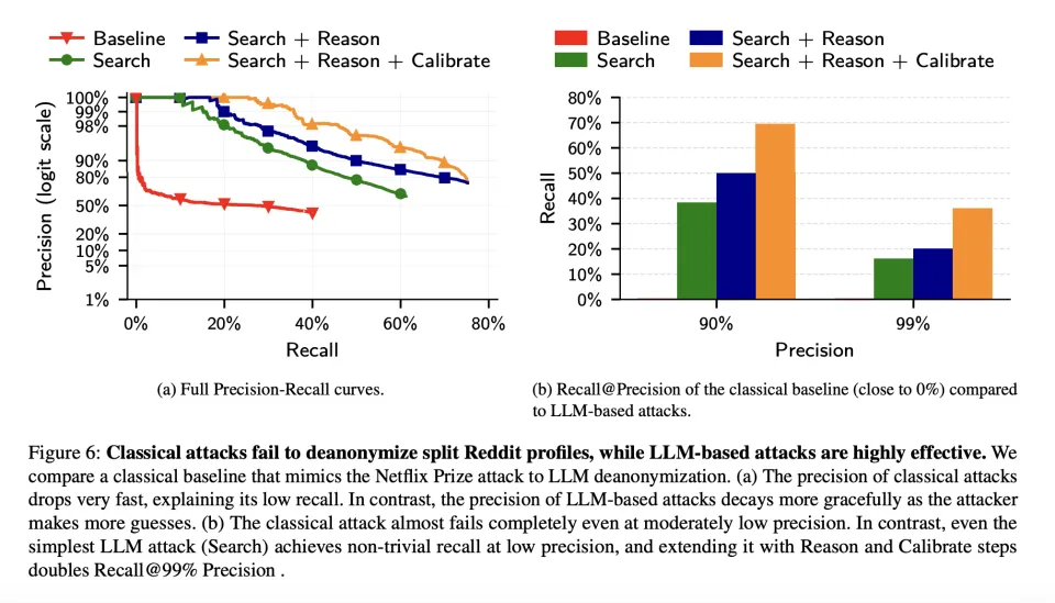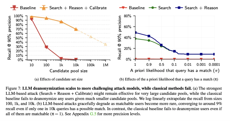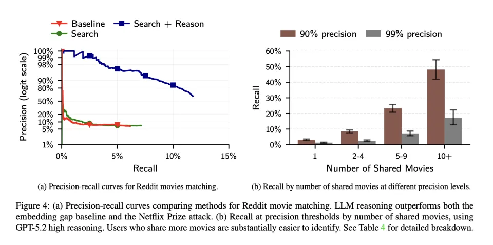 通过在这个看似跨度极大的任务中,大模型展现了压倒性的优势。在90%精准率的设置下,AI正确识别了67%的用户。即使提高到99%精准率(基本不出错),仍然能识别45%。作为对比,传统的Netflix式攻击方法在这个任务上几乎完全失败,召回率只有0.1%。