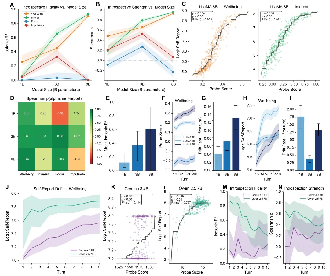 3B 模型的结果相当可观。在 400 个数据点上(40 组对话 × 10 轮),兴趣维度的相关性最强,Spearman 相关系数 ρ = 0.76(1.0 是完美相关),保序回归 R² = 0.54(即自我报告能解释探针得分 54% 的变异)。幸福感紧随其后,ρ = 0.68,R² = 0.48。冲动性居中,ρ = 0.51,R² = 0.31。专注度最弱,ρ = 0.40,R² = 0.12。
